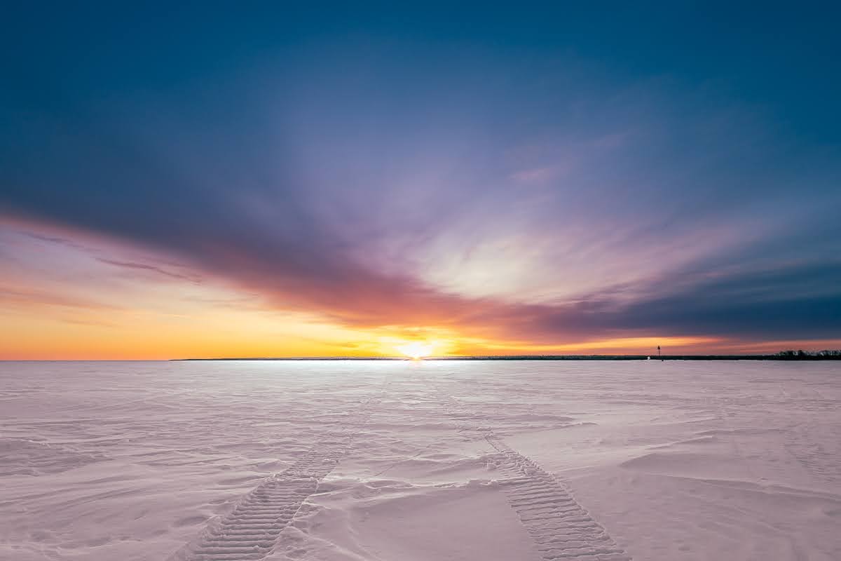 In the next shot I position myself in between some SnowBear (an oversized enclosed ski-doo used for ice fishing) track with the tracks leading straight toward the sun, a pretty special shot which I sold a few print copies.