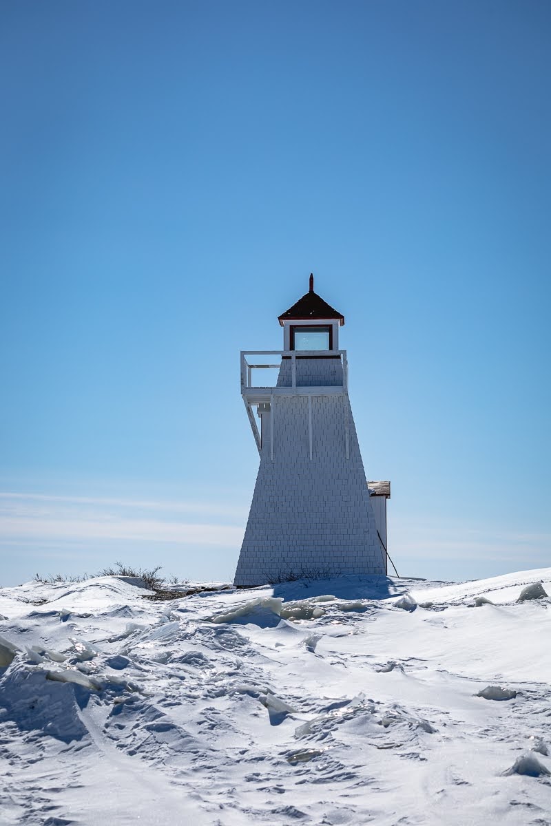 Later, my wife and I decided to take a walk across the lake with our goal being to reach Black Island a few kilometers away, in the first part of our walk I took that shot of the historic lighthouse across a blue sky with the jagged foreground of an ice-ridge.