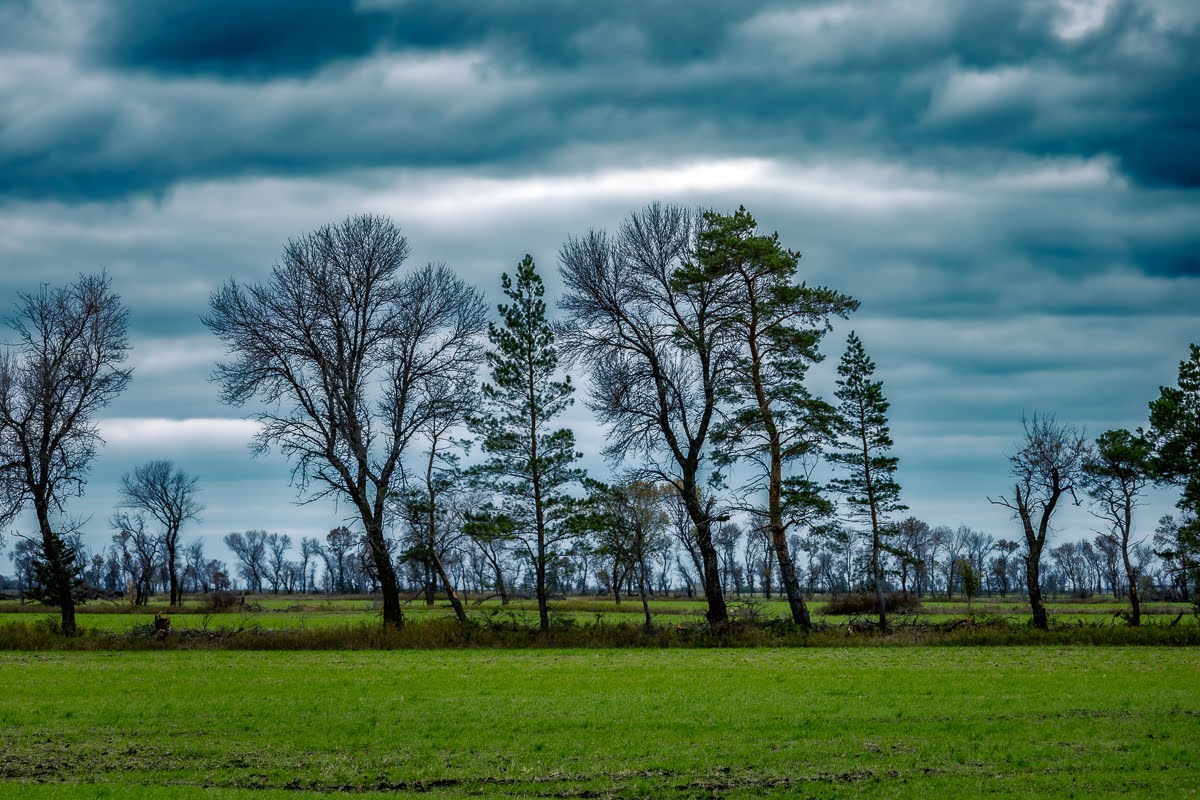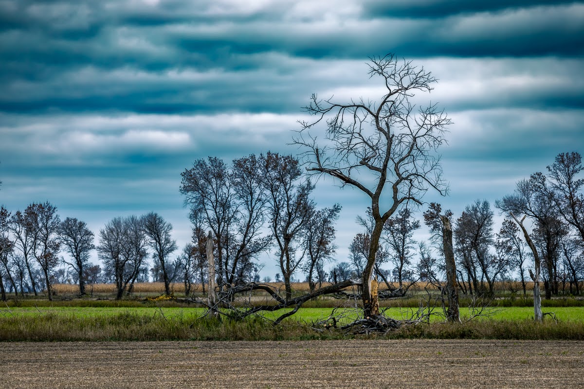 These next few pictures I was driving down a gravel road behind Otterburne in Southern Manitoba and we had an interesting cloudy sky contrasting with the still green portion of a field behind a tree line which had lost their leaves already.