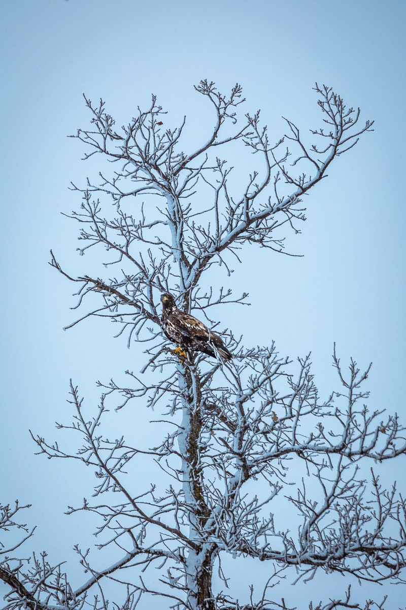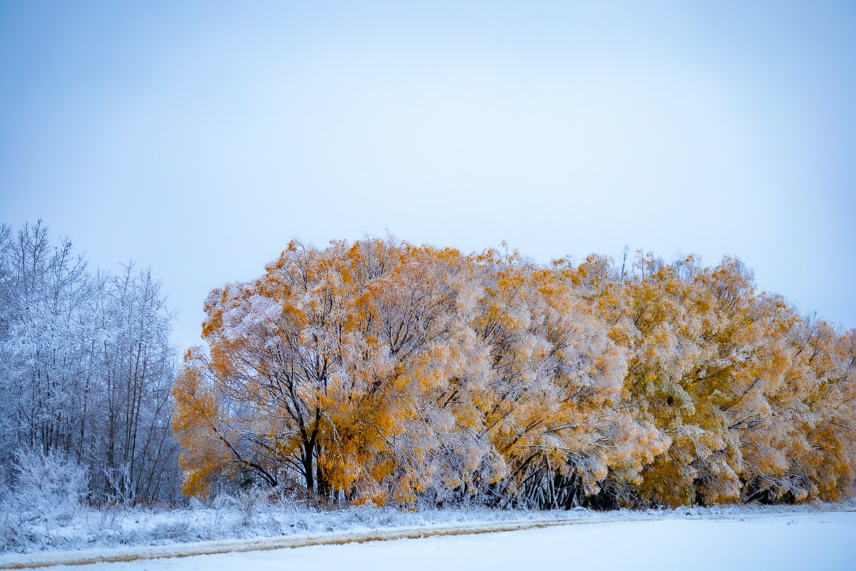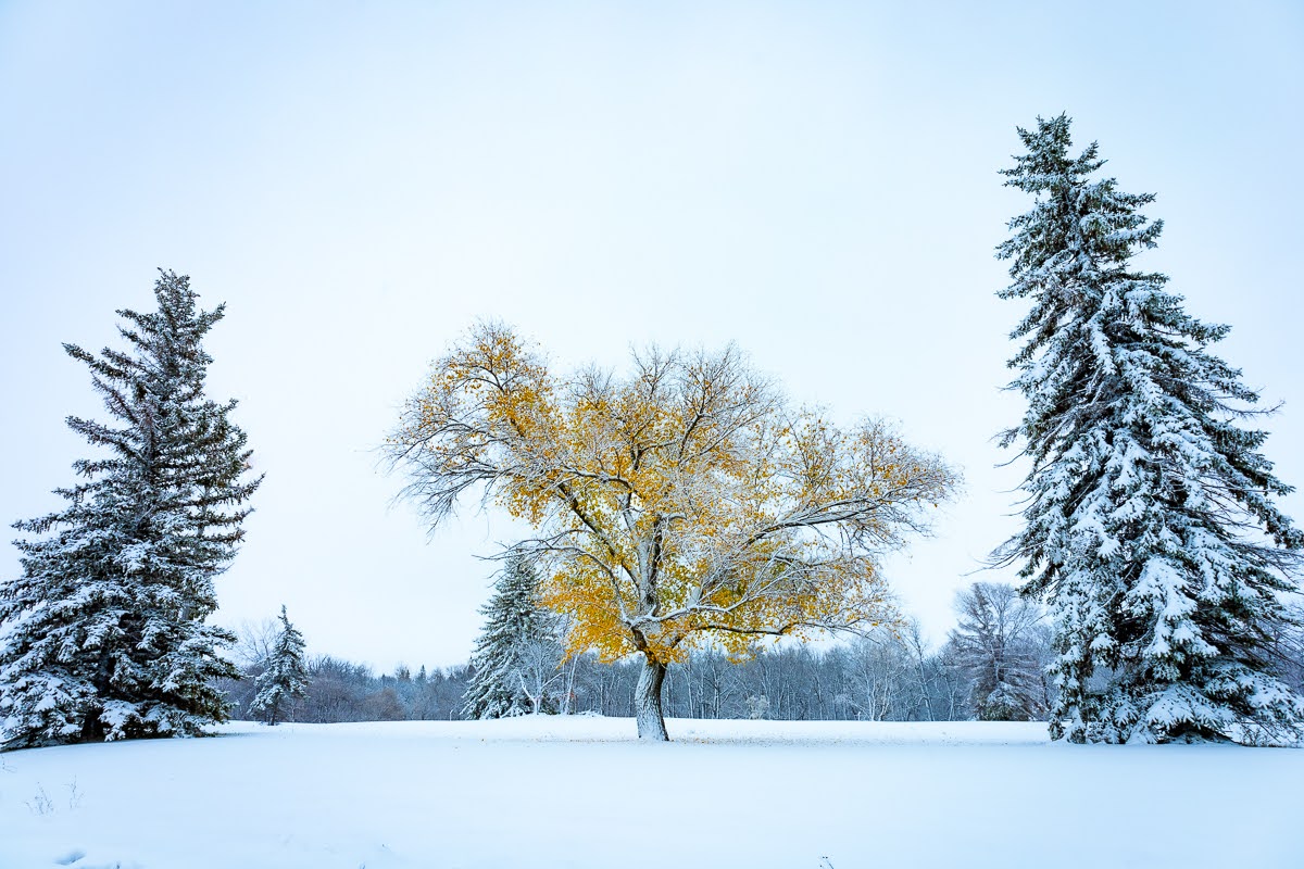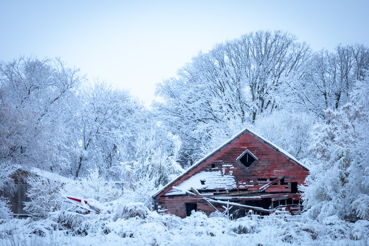 And then, a few days before Halloween, we had a pretty significant amount of snow falling and I captured this young eagle perched on a snow covered tree and then a few very interesting scenes with trees that had not lost their leaves yet giving a really nice contrast with the snow blanket, I also shot a red barn which also really contrasted with the landscape.